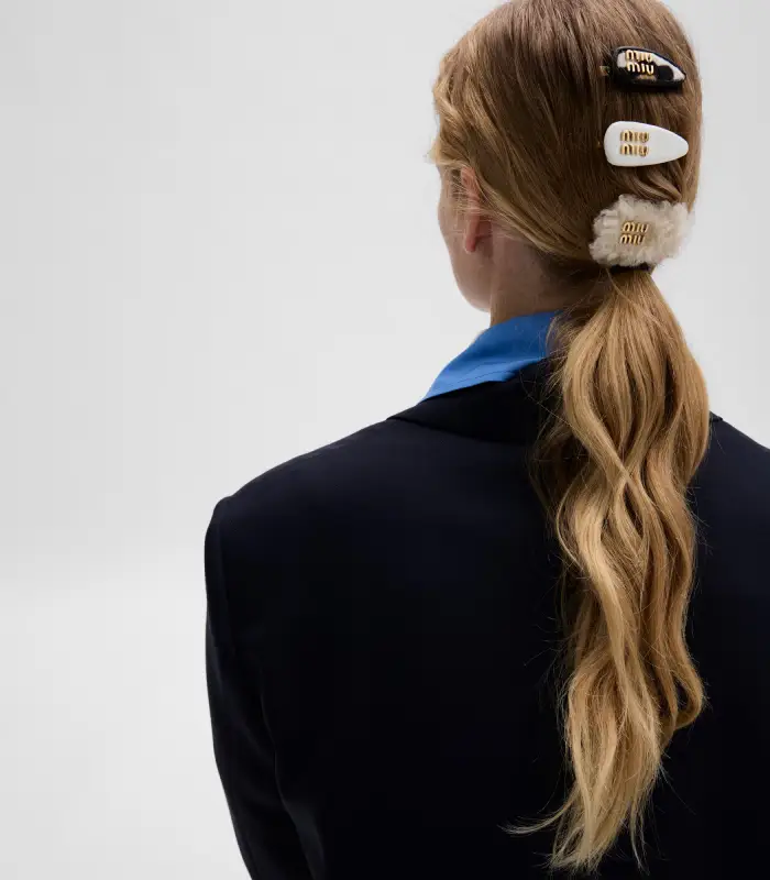 A spotted leopard effect, the soft touch of shearling, and glossy patent leather stand out in this hair clip set. The lettering logo completes the design with an iconic note.