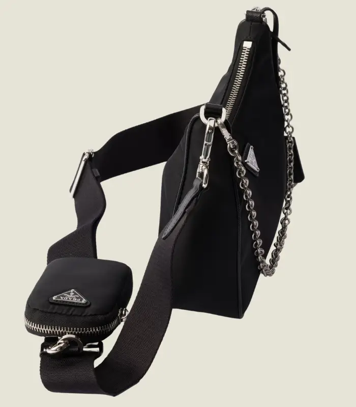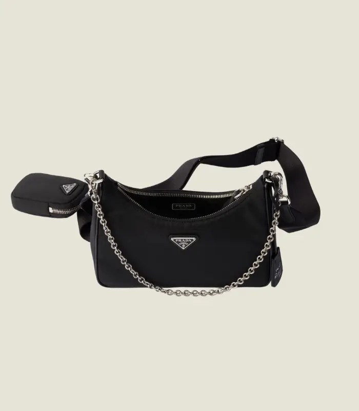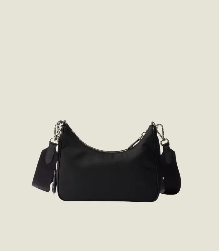 Inspired by the iconic mini hobo bag, the Prada Re-Edition 2005 shoulder bag is made of Re-Nylon: a regenerated nylon yarn (ECONYL®)produced from recycled, purified plastic trash collected in the ocean, fishing nets and textile waste fibers. This versatile bag with Saffiano leather trim comes with a detachable pouch attached to the shoulder strap.